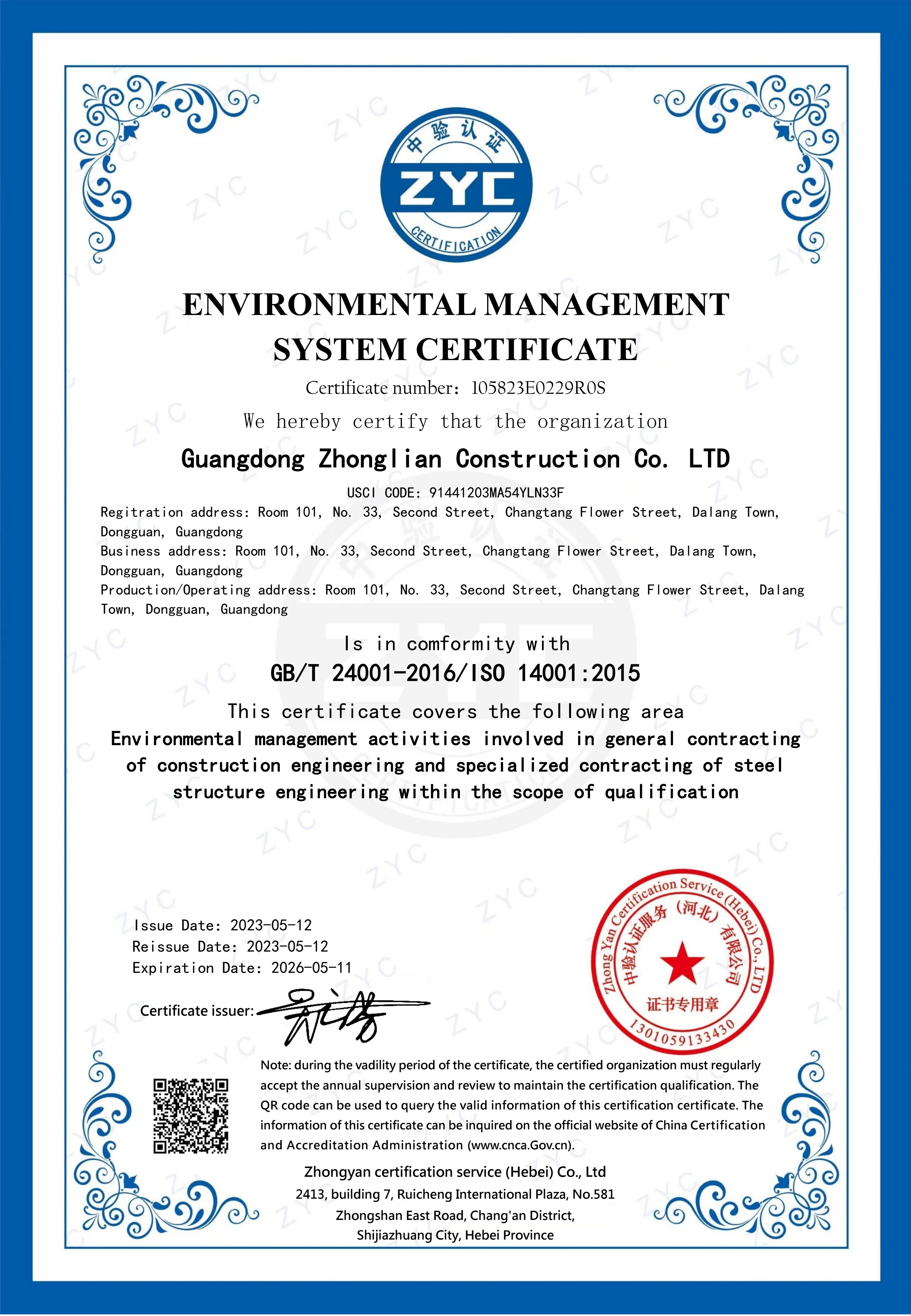 环境管理体系认证证书